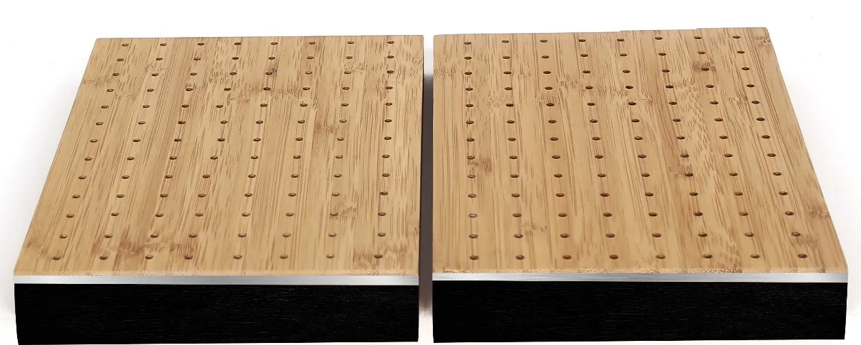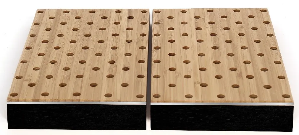 The CoreBOO DROP-IN Perforated Panels are similar to our standard Perforated FELT Panels but are sized to fit standard ceiling grid assemblies. The panels are available in 3 standard perforations sizes and patterns, and like the Perforated Felt panels are made using a sandwich construction where the CoreBOO veneer is laminated onto a thin, recycled aluminum substate (adds rigidity, stability, and fire-resistance), and then that layer is laminated onto a 24mm recycled PET felt substrate. NOTE: other perforation patterns and/or panel sizes are available, so please inquire if interested.