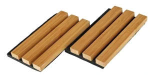 The ‘AIR- MESH’ construction is made by mounting the CoreBOO Slats onto a ½” bamboo cross beam and sandwiching an acoustic ‘Air Mesh’ fabric between the 2 layers. The Air Mesh fabric is designed to provide high noise reduction coefficients for the assembly (NRC = 0.75 when there is an 8” or greater ‘air plenum’ above the panel). |