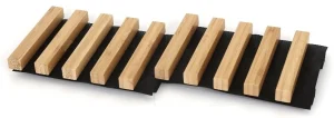 | The ‘AIR- MESH’ construction is made by mounting the CoreBOO Slats onto a ½” bamboo cross beam and sandwiching an acoustic ‘Air Mesh’ fabric between the 2 layers. The Air Mesh fabric is designed to provide high noise reduction coefficients for the assembly (NRC = 0.75 when there is an 8” or greater ‘air plenum’ above the panel). |
