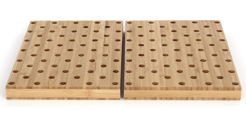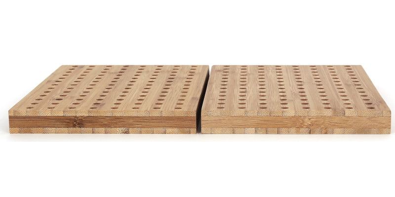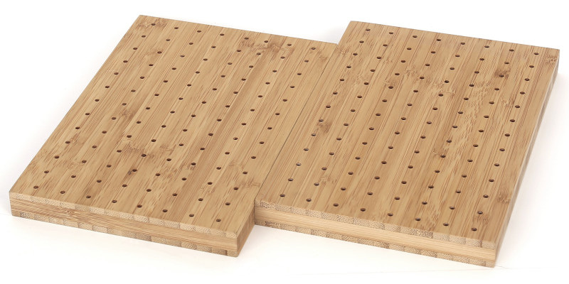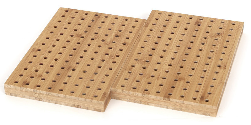 - Perforated panels can be made with perforation diameters down to 0.5mm. For desired perforation diameters between 0.5-3mm, the panel material will be made from MDF panels faced with bamboo veneers (on both sides). The SOLID bamboo is too hard/dense to effectively perforate below 3mm. double-sided bamboo veneer faced MDF.