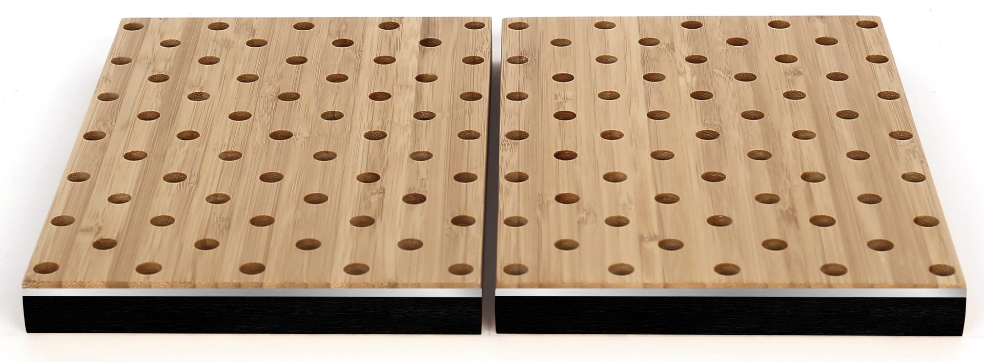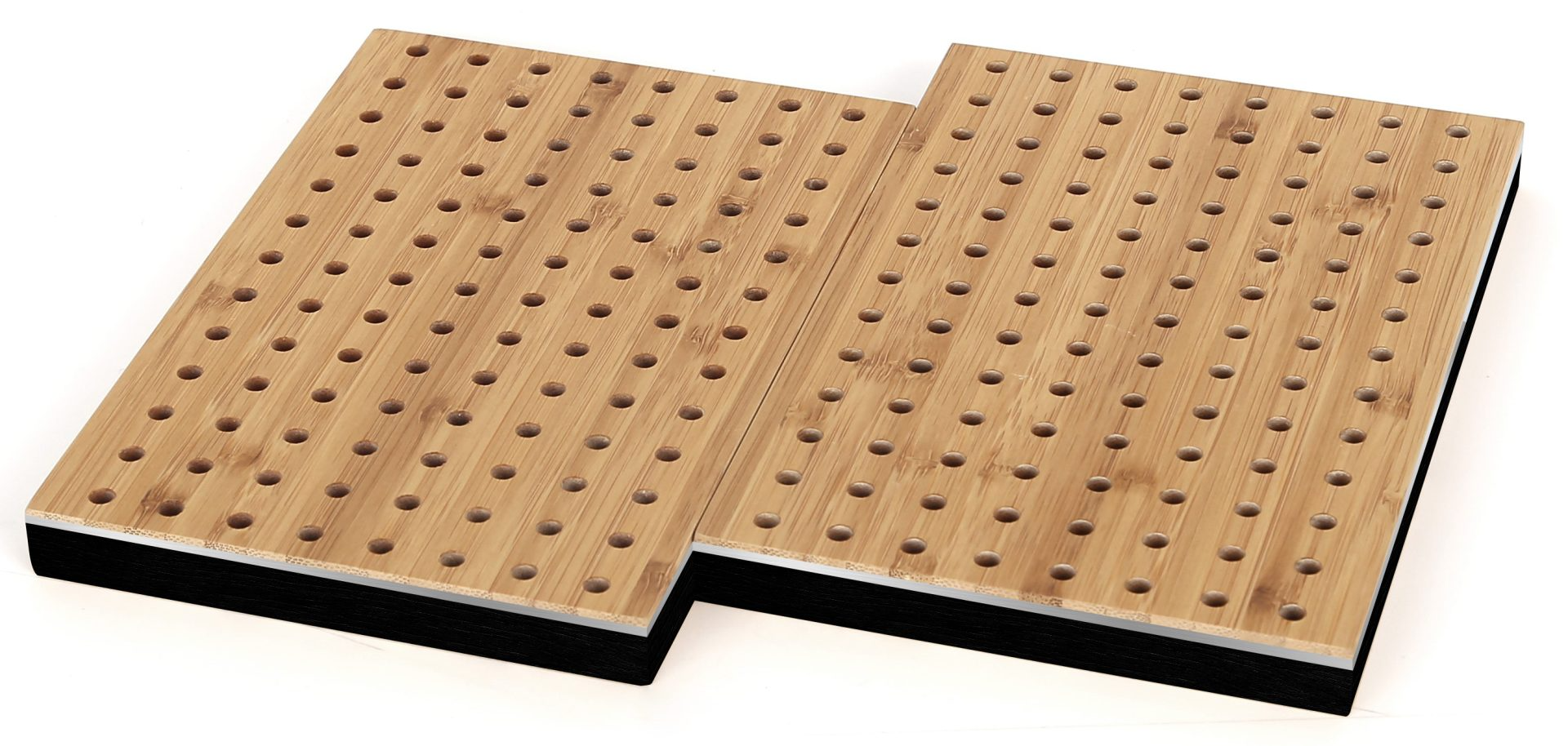 The CoreBOO PET Perf Panels are 1/2” panels that are made by applying perforated CoreBOO veneer onto a recycled PET acoustic substrate. Available in 3 standard perforation patterns, these panels boost sound absorption when compared to the Solid CoreBOO panels. Note: custom perforation patterns (diameters and spacing) are available, as are different thicknesses and colors of the PET acoustic substrate.