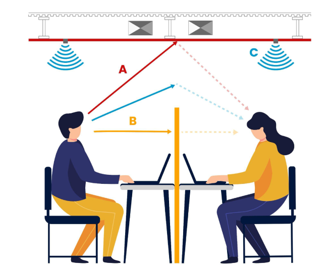 Here we show sounds within an office space. Some gets absorbed (in the ceiling panels), some can be blocked by dividers, and then through the use of Sound Masking, speakers emit sound to counter what is remaining with the space.