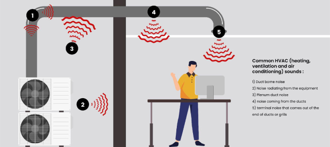 Here are common HVAC sounds: 1) Duct borne noise, 2) Noise radiating from the equipment, 3) Plenum duct noise, 4) noise coming from the ducts, and 5) terminal noise that comes out of the end of ducts or grills