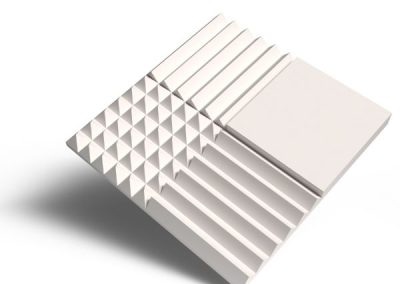 Our Acoustifoam™ TILES bring our highly customizable and acoustic absorptive material really into the realm of “design’. Available in 10 standard patterns, these large format tiles come in a natural white color, though can further be color customized through our Pantone Custom Coloring (PCC). Touting an NRC rating of 0.70 (compare to 0.25 for 7mm felt), Acoustifoam Tiles provide truly decorative sound absorption.